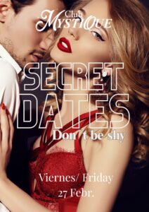 SECRET DATES – DON´T BE SHY theme night @mystique, enjoy a different & hot night out. Throughout the night, the couples & singles loose their shyness and become completely uninhibited. LET YOURSELF GO…..